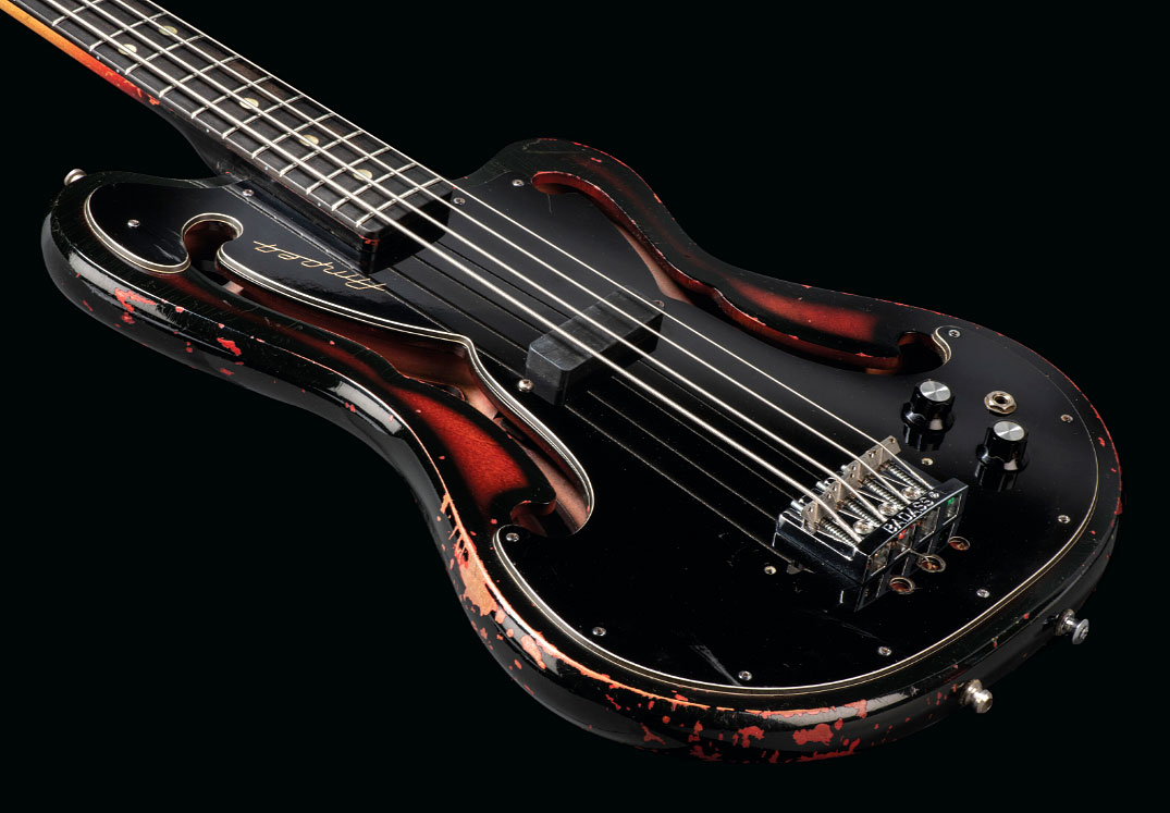 A semi-solidbody electric bass guitar, AMB-1. The pickguard engraved with the logo Ampeg, the body with 'f'-hole cutouts, the finish of a red-black sunburst. See here a detail of the headstock. Mark Knopfler purchased this Ampeg bass via bassist Glenn Worf in 2005 and kept it for studio use. Worf used the AMB-1 to record the bass part on the song Remembrance Day in 2007, which would be released on Knopfler’s sixth solo studio album Get Lucky in 2009. Album co-producer Guy Fletcher was