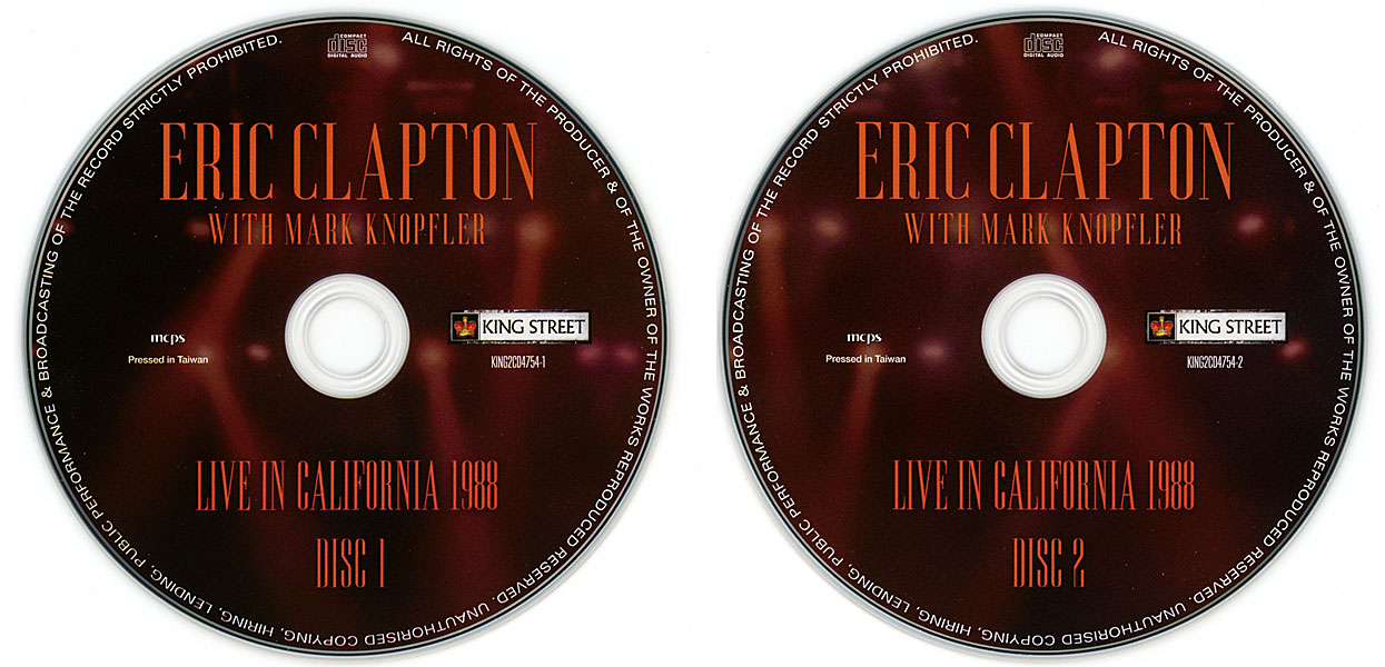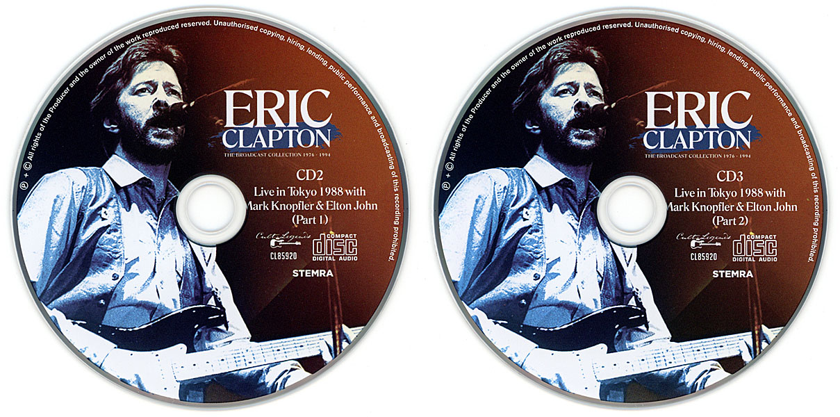 | Comments | Unique 8CD + 1DVD-R box featuring all four concerts of Eric Clapton and Mark Knopfler in Japan 1988. Limited to 300 copies and numbered (no.274). The bonus DVD-R included with this set is an unedited MTV interview apparently recorded at the end of the 1986 or 1987 tours, as Eric Clapton refers to those shows as just having concluded. See more pictures of this great box set here. | ||