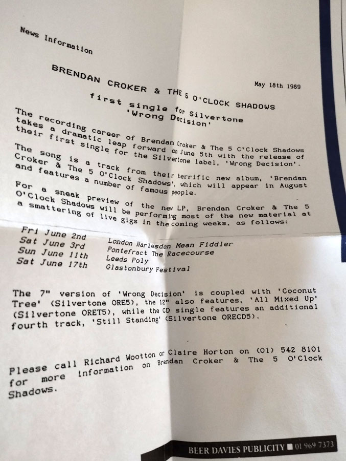 Additional information: this was a concert from Brendan Croker and 'The 5 O'Clock Shadows with Mark Knopfler as special guest. A few tracks from that performance ended up on a single called EP