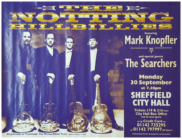 Besides the succesful album and tour in 1990, The Notting Hillbillies played a few special concerts between 1990 and 1996. On Saturday 3rd July 1993, Mark Knopfler, Brendan Croker and Steve Phillips did a charity gig at the Town & Country Club in Leeds. The concert was a charity show for Kirkstall Valley Campaign and the three men played a very interesting acoustic set of 19 songs. A few days later The Notting Hillbillies did another charity concert for the Swan Hunter shipyard. Guy Fletcher was not available that day and instead Alan Clark played keyboards. A soundboard recording was made of this show, but was never officially released. In 1994, another one-off charity show was played at the Grosvenor House Hotel. And in 1996, The Notting Hillbillies played a one-off show at Mosimann's. It was a private show for Renault with just 80 seats of £200 per ticket. Most likely also a charity show. And in September 1996, another charity concert was played in Sheffield. |