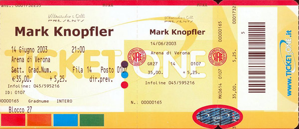 After the Sailing to Philadelphia tour in 2001, the third solo album The ragpicker's dream was released on 30th September 2002. Mark did a lot of promotional work for this album on TV and radio shows from September to December 2002. Getting ready for the new tour, rehearsals were planned in March 2003. However, Mark Knopfler got a motorcycle accident on 17th March 2003, while he was on his way to the rehearsals for the tour. According to court reports, a 23 year old woman did not properly check her mirrors or indicate when she made a hard right into a gas station in Belgravia, central London where she collided with Knopfler's motorbike. Mark broke his shoulder, collar bone and seven ribs. Since he got so seriously injured, it was very unlikely that the tour could go ahead as the first concert was just about one month away. On 31st March, the official announcement was made that the complete tour was definately cancelled. Many fans already had their tickets by that time, several can be found in the list below. An official statement on Mark Knopfler’s site mentioned: "Mark is obviously bitterly disappointed and would like to thank the fans who have sent him get well messages." Mark also issued