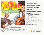 Intro by Chet atkins 2. Introduction Mark Knopfler 3. I'll see you in my dreams (CA & MK) 4. Walk of life (MK & CA) 5. Introduction Everly Brothers 6. Medley (EB, CA, MK): All I have to do is dream By bye love Wake up little Suzie 7. Why worry (EB, CA, MK) 8. Introduction Emmylou Harris 9. Precious memories (EH) 10. Waltz for the lonely (CA) 11. I keep forgetting (MM) 12. Rose in paradise (WJ) 13. Good hearted woman (WJ, WN) 14. Island in the sea (WN) 15. Sunrise (CA) 16. Imagine (CA, MK) 17. I still can't say goodbye (CA) 18. Corinna Corinna (All) CA: Chet Atkins MK: Mark Knopfler EB: Everly Brothers (Don and Phil Everly) EH: Emmylou Harris MM: Michael McDonald WJ: Waylon Jennings WN: Willie Nelson |