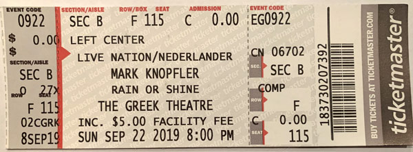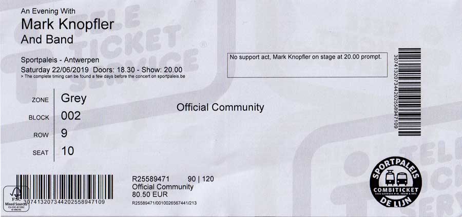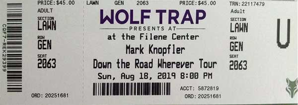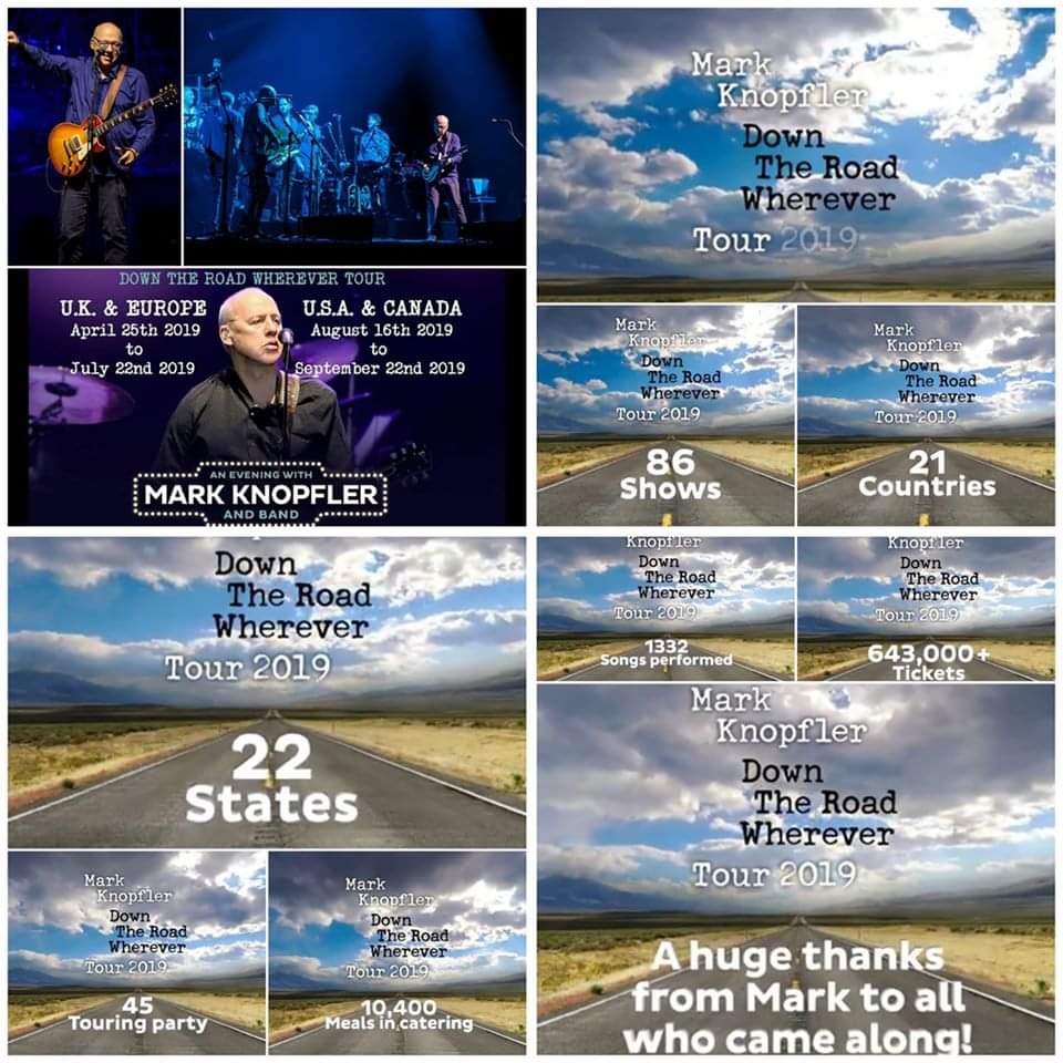 friend, Chet Atkins. All shows of the tour were recorded. The audio soundboard recordings could be bought in the Mark Knopfler on-line shop as a souvenir and were available as MP3 and FLAC (lossless audio) downloads. Also available was an exclusive item to MarkKnopfler.com, a replica of a Gibson Les Paul. Each 8GB USB 2.0 key has a chrome finish on the back, and an engraving of "Down the road wherever tour - Mark Knopfler". To round off the realism of this unique item, each key is packed in a hard shell road case, complete with handles, clasps and leather-look graphics. This USB stick was sold without any concert on the stick itself. In December 2019, another USB guitar stick was made available. This time a red Fender Stratocaster with on the side of the neck the engraving "Down the road wherever tour - Mark Knopfler". This came in the same hard shell case. Some